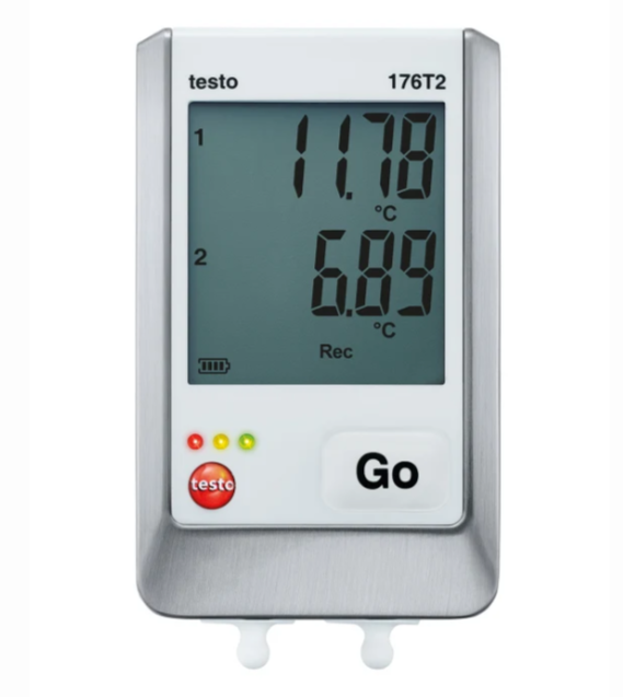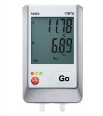 testo 176 T2 temperature logger with two inputs for external Pt100 probes, including wall bracket, lock, battery and calibration protocol.